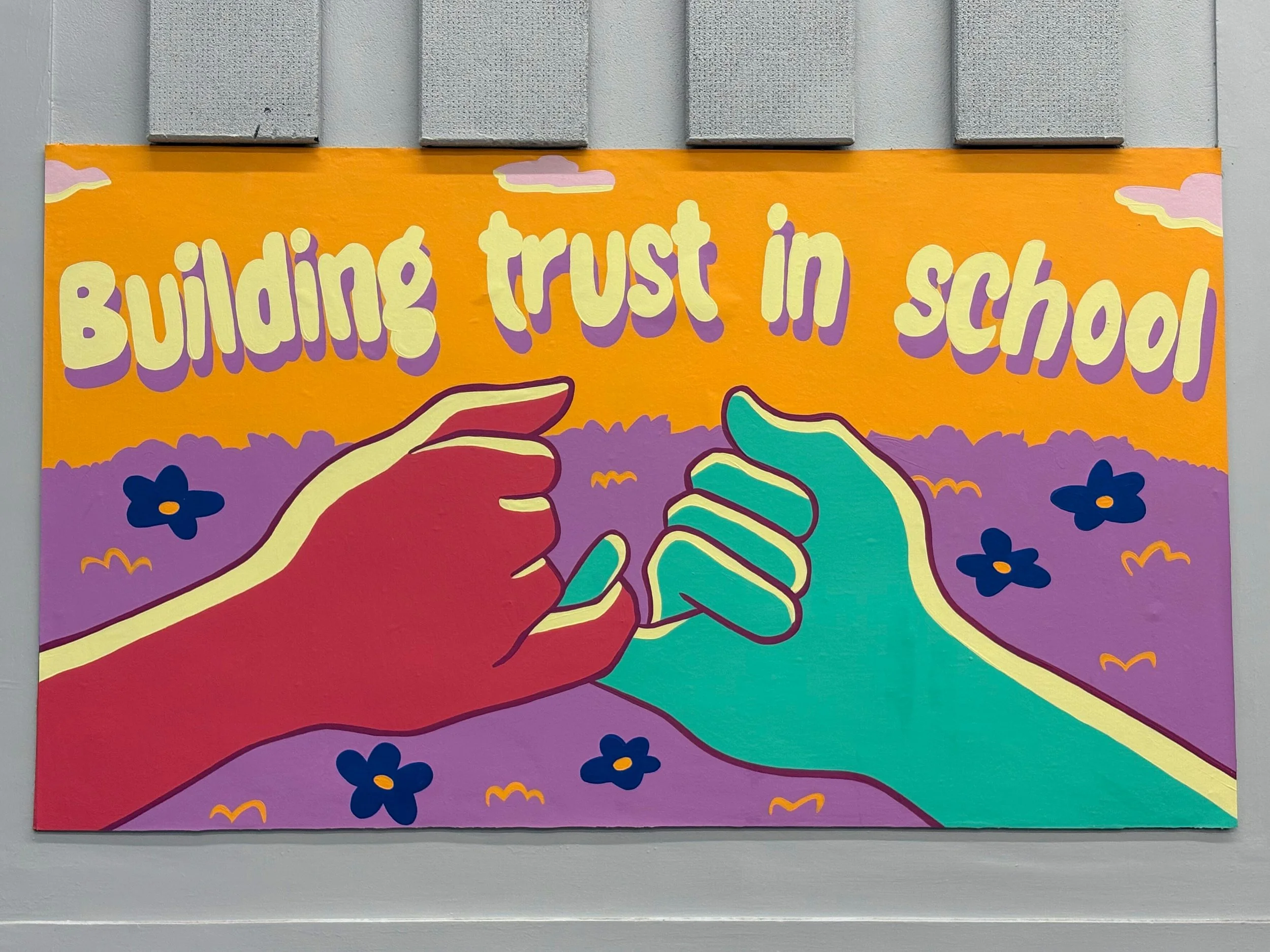 From the last collaboration between Plushie and Thrive Collective to paint six mini polytab murals in the auditorium of PS171 Magnet School of the Arts. They asked for Plushie to return for a second round of six more mini murals during summer break, leaving a total of twelve mini murals surrounding the entire auditorium. A gift from Principal Kavourias to her new and returning students on summer break for when they go to the school in the fall.