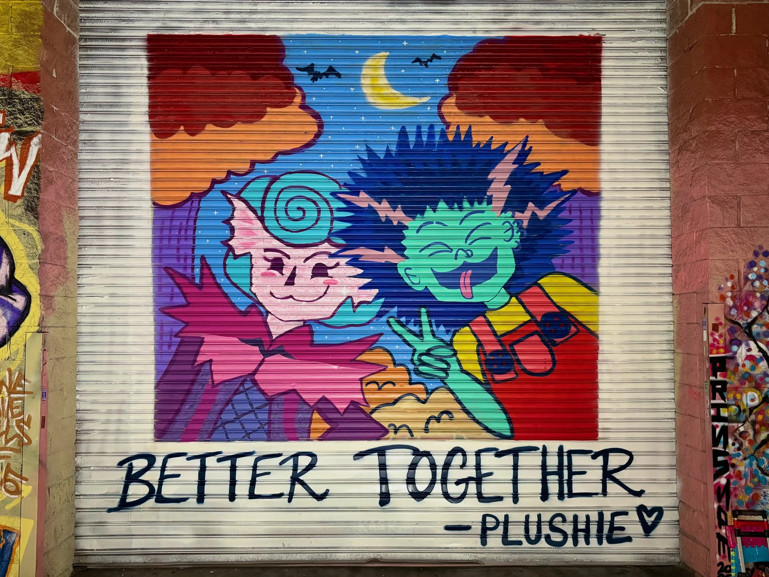 In the summer of 2025, Plushie was invited to partake in Astoria’s biggest mural event, Welling Walls. Local and visiting artists partnered up with the Welling Court and Astoria residents to paint murals and celebrate community and bring positivity during hard times. This mural is meant to highlight and emphasize the importance of love of family whether it be chosen or blood.