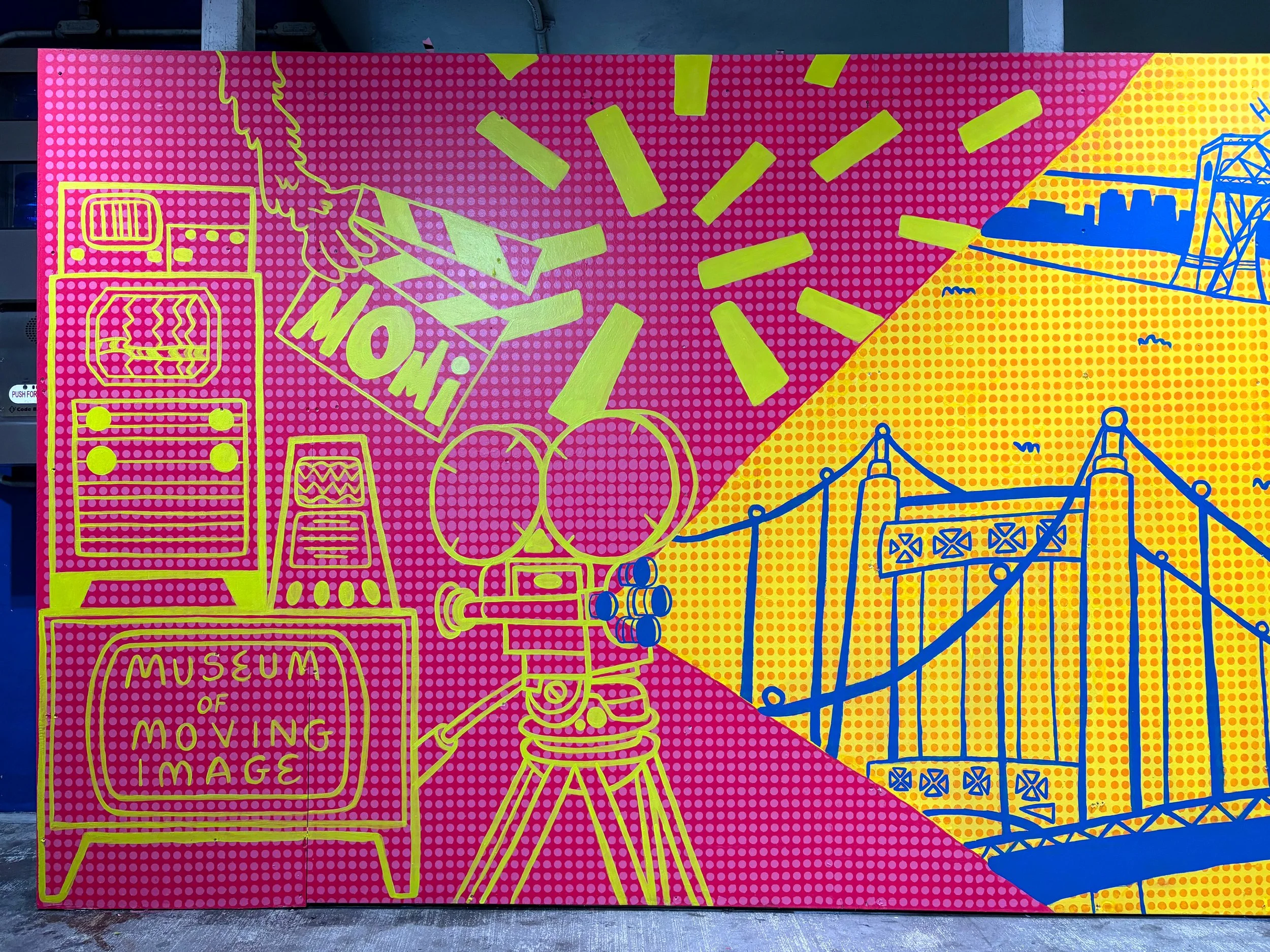 Through an open call hosted and judged by The Queens Culture & Arts Network , Port Authority of NY & NJ and Variety Boys and Girls Club, Plushie was chosen from countless submissions to design a mural for one of La Guardia Airport’s Parking Garage. The mural was designed to express many Queens monuments and favorite places to visit in the borough to encourage travelers to see it for themselves. Plushie, being Queens raised, included a total of 15 places and sights to enjoy in Queens based on her personal love, experience and shared memories of her and her loved ones in Queens. With the help of her team, they painted a total of 420 sq ft. Located in La Guardia Airport’s Terminal B 2nd floor parking garage, travelers from all around the world and returning New Yorkers alike, will get to see this nostalgic and comic book style inspired guide to Queens as they await for their Lyfts and Uber.